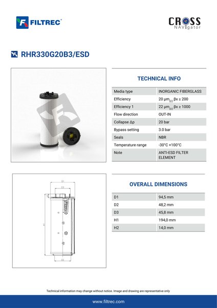 Filtrec RHR330G20B3/ESD Replaces the Filtrec RHR330G20B/ESD