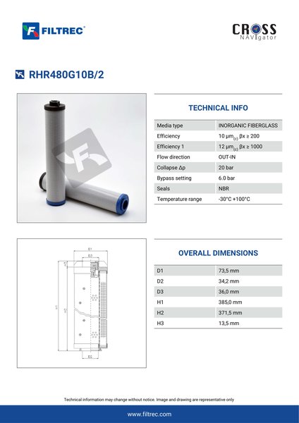 Genuine Filtrec RHR480G10B/2. This Filtrec element is designed to meet or exceed the quality and performance of brand OEM’s ensuring superior filtration performance and long-lasting durability.
