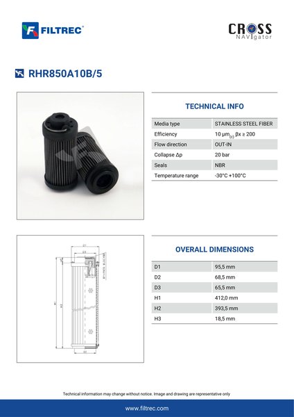 Genuine Filtrec RHR850A10B/5. This Filtrec element is designed to meet or exceed the quality and performance of brand OEM’s ensuring superior filtration performance and long-lasting durability.