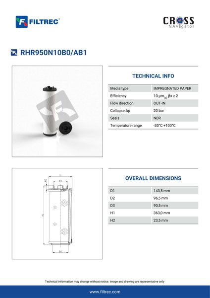 Engineered with their high performance media and a durable design, the RHR950N10B0/AB1 provides reliable and consistent performance over its lifespan, even in harsh operating environments. When you order from FilterFinder, you can trust that you are getting a reliable and high-quality replacement filter that will keep your system running smoothly.
