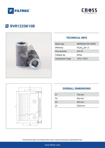 Genuine Filtrec RVR1225K10B. This Filtrec element is designed to meet or exceed the quality and performance of brand OEM’s ensuring superior filtration performance and long-lasting durability.Engineered with their high performance media and a durable design, the RVR1225K10B provides reliable and consistent performance over its lifespan, even in harsh operating environments. When you order from FilterFinder, you can trust that you are getting a reliable and high-quality replacement filter that will keep your system running smoothly.