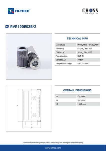 The efficiency of the element is shown using the Micron (µ) and Beta (β) ratings. The micron rating indicates the size of the particle being filtered and the beta rating the efficiency, calculated as 1/β.