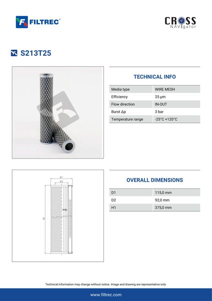 Genuine Filtrec S213T25. This Filtrec element is designed to meet or exceed the quality and performance of brand OEM’s ensuring superior filtration performance and long-lasting durability.