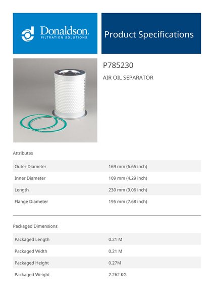 Genuine Donaldson P785230 Air Oil Separator is designed to separate oil from compressed air systems, reducing oil carryover and improving air quality. It enhances system efficiency and protects downstream equipment.