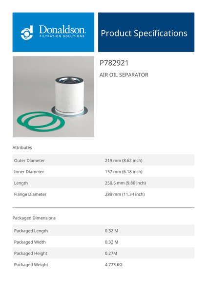 Genuine Donaldson P782921 Air Oil Separator is designed to separate oil from compressed air systems, reducing oil carryover and improving air quality. It enhances system efficiency and protects downstream equipment.