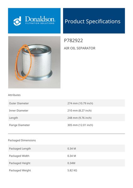 Genuine Donaldson P782922 Air Oil Separator is designed to separate oil from compressed air systems, reducing oil carryover and improving air quality. It enhances system efficiency and protects downstream equipment.