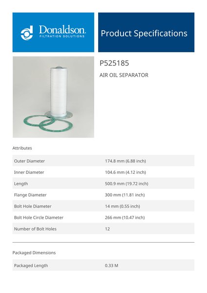 Genuine Donaldson P525185 Air Oil Separator is designed to separate oil from compressed air systems, reducing oil carryover and improving air quality. It enhances system efficiency and protects downstream equipment.