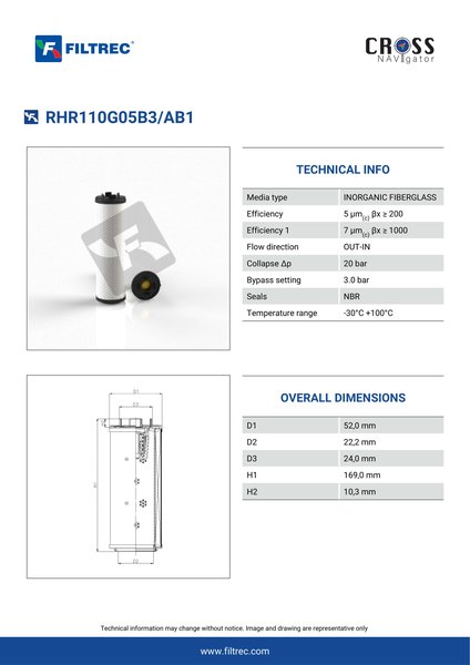 Genuine Filtrec RHR110G05B3/AB1. This Filtrec element is designed to meet or exceed the quality and performance of brand OEM’s ensuring superior filtration performance and long-lasting durability.Engineered with their high performance media and a durable design, the RHR110G05B3/AB1 provides reliable and consistent performance over its lifespan, even in harsh operating environments. When you order from FilterFinder, you can trust that you are getting a reliable and high-quality replacement filter that will keep your system running smoothly.