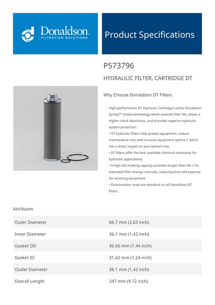 Genuine Donaldson P573796 Hydraulic Filter, Cartridge Dt is engineered with advanced depth filtration technology, offering enhanced dirt retention and fluid cleanliness. It ensures optimal performance in high-pressure hydraulic systems, effectively protecting critical components from wear and extending system life.This filters robust construction and superior filtration efficiency make it ideal for demanding applications. Its reliable performance helps minimize maintenance costs and system downtime, ensuring consistent operation under tough conditions.