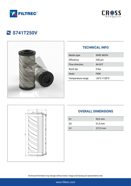 Genuine Filtrec S741T250V. This Filtrec element is designed to meet or exceed the quality and performance of brand OEM’s ensuring superior filtration performance and long-lasting durability.