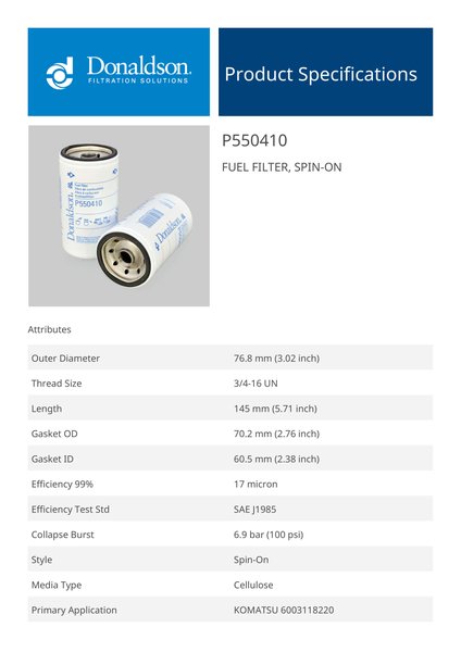 The efficiency of the element is shown using the Micron (µ) and Beta (β) ratings. The micron rating indicates the size of the particle being filtered and the beta rating the efficiency, calculated as 1/β.