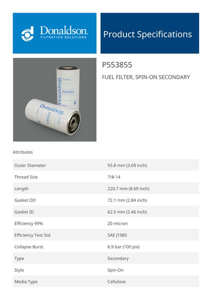 Genuine Donaldson P553855 Fuel Filter, Spin-On Secondary is designed to provide reliable performance in fuel filter, spin-on secondary applications. Built with high-quality materials, it ensures consistent functionality and durability.