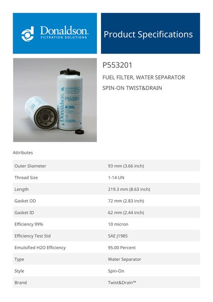 Genuine Donaldson P553201 Fuel Filter, Water Separator Spin-On Twist&Drain effectively separates water and contaminants from diesel fuel, ensuring clean fuel delivery and preventing engine damage. Its twist-and-drain feature allows for easy water removal.