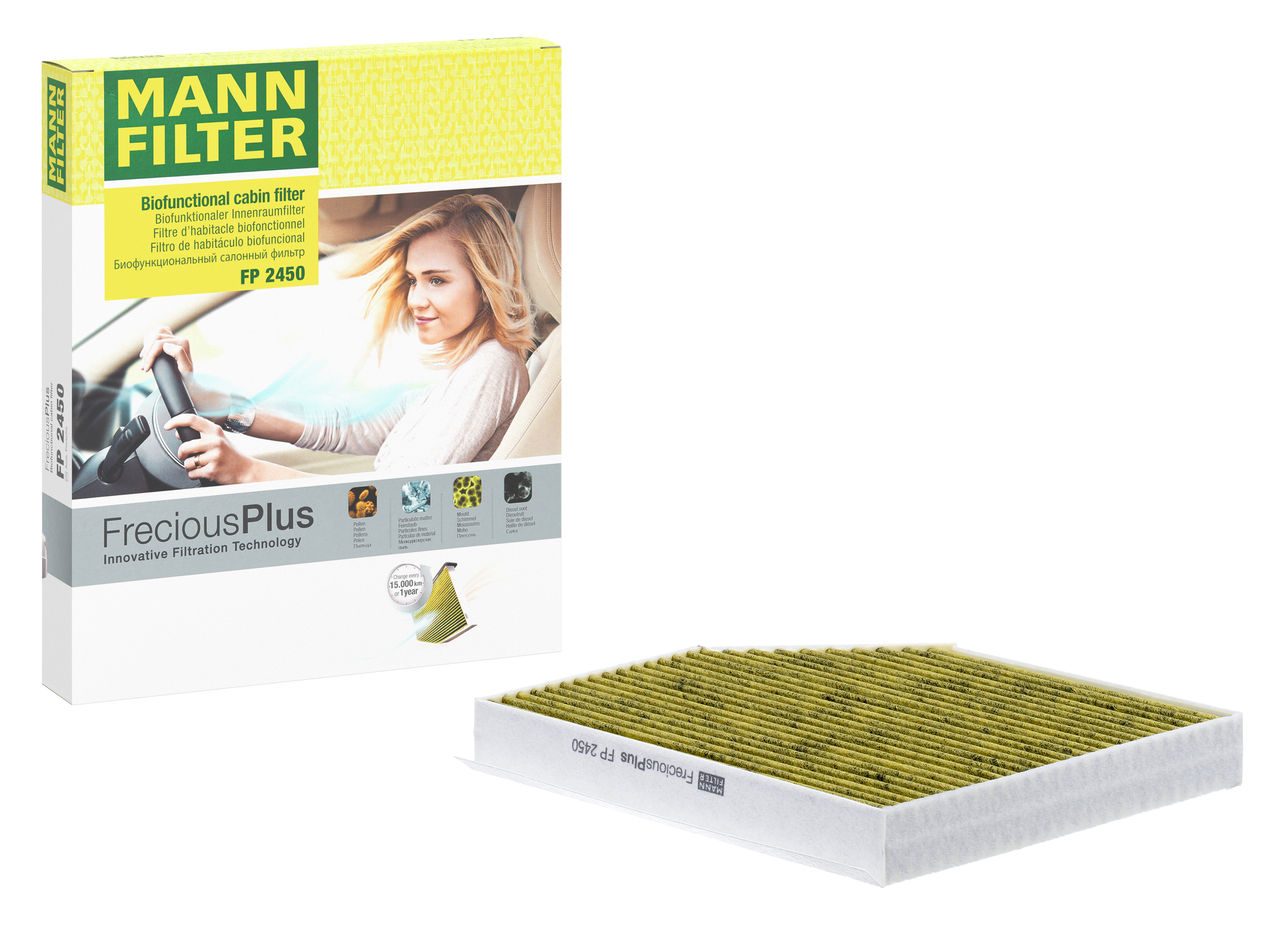 Biofunctional MANN-FILTER FreciousPlus cabin air filters - nearly 100% protection against nitrogen oxides, dust, allergens and mould - harmful gases and unpleasant odours are also eliminated and virus aerosols filtered. The three-layer filter technology absorbs almost 100% of allergens, reduces the growth of molds and bacteria by more than 98% and stops fine dust almost completely.Specification