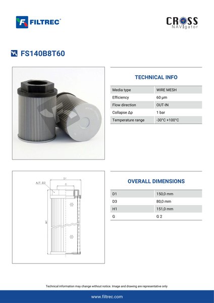 Genuine Filtrec FS140B8T60. This Filtrec element is designed to meet or exceed the quality and performance of brand OEM’s ensuring superior filtration performance and long-lasting durability.