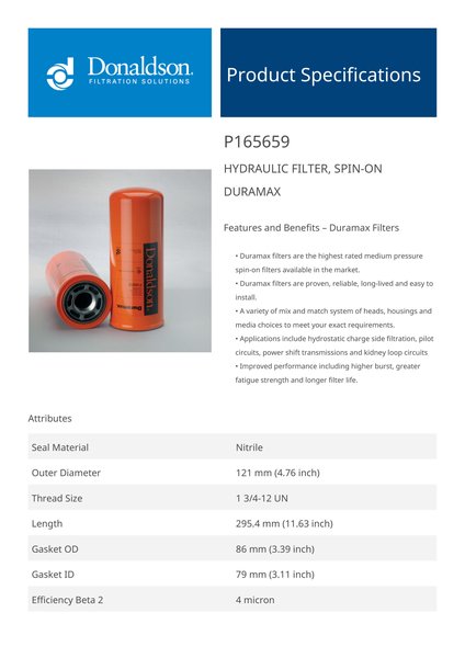 Genuine Donaldson P165659 Hydraulic Filter, Spin-On Duramax combines the convenience of a spin-on filter with the robust durability of Donaldson’s Duramax line. It offers high-efficiency filtration, effectively removing contaminants while withstanding high-pressure environments.