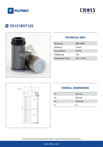 Engineered with their high performance media and a durable design, the FS121B5T125 provides reliable and consistent performance over its lifespan, even in harsh operating environments. When you order from FilterFinder, you can trust that you are getting a reliable and high-quality replacement filter that will keep your system running smoothly.