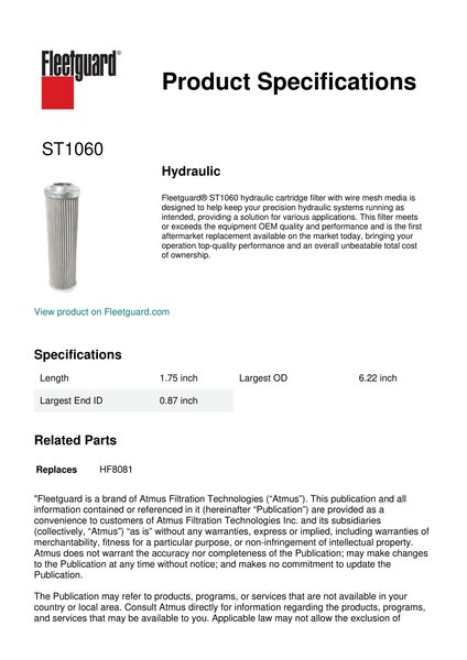 Fleetguard® ST1060 hydraulic cartridge filter with wire mesh media is designed to help keep your precision hydraulic systems running as intended, providing a solution for various applications. This filter meets or exceeds the equipment OEM quality and performance and is the first aftermarket replacement available on the market today, bringing your operation top-quality performance and an overall unbeatable total cost of ownership.Specification