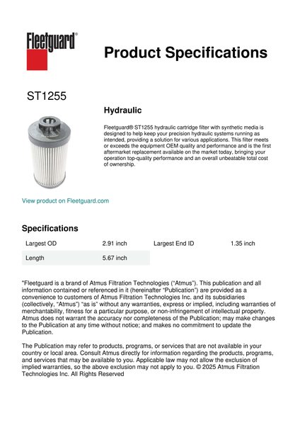 Fleetguard® ST1255 hydraulic cartridge filter with synthetic media is designed to help keep your precision hydraulic systems running as intended, providing a solution for various applications. This filter meets or exceeds the equipment OEM quality and performance and is the first aftermarket replacement available on the market today, bringing your operation top-quality performance and an overall unbeatable total cost of ownership.Specification