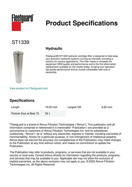 Fleetguard® ST1339 hydraulic cartridge filter is designed to help keep your precision hydraulic systems running as intended, providing a solution for various applications. This filter meets or exceeds the equipment OEM quality and performance and is the first aftermarket replacement available on the market today, bringing your operation top-quality performance and an overall unbeatable total cost of ownership.Specification