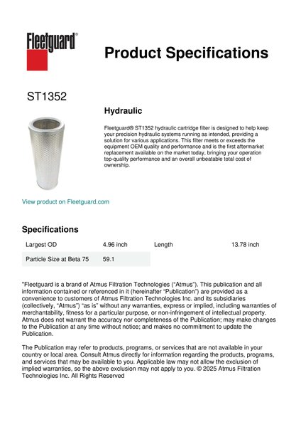 Fleetguard® ST1352 hydraulic cartridge filter is designed to help keep your precision hydraulic systems running as intended, providing a solution for various applications. This filter meets or exceeds the equipment OEM quality and performance and is the first aftermarket replacement available on the market today, bringing your operation top-quality performance and an overall unbeatable total cost of ownership.Specification