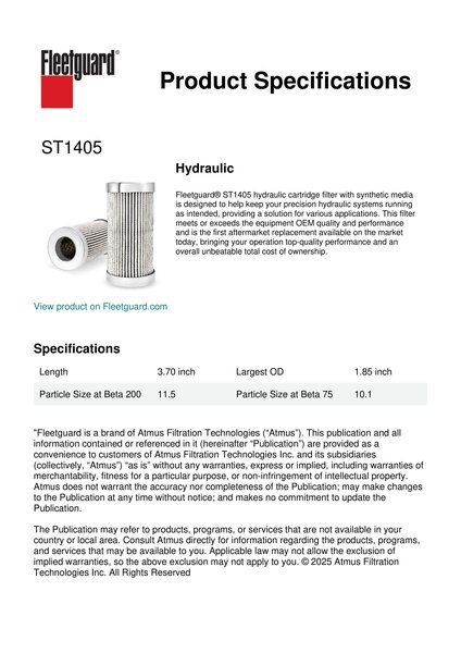 Fleetguard® ST1405 hydraulic cartridge filter with synthetic media is designed to help keep your precision hydraulic systems running as intended, providing a solution for various applications. This filter meets or exceeds the equipment OEM quality and performance and is the first aftermarket replacement available on the market today, bringing your operation top-quality performance and an overall unbeatable total cost of ownership.Specification