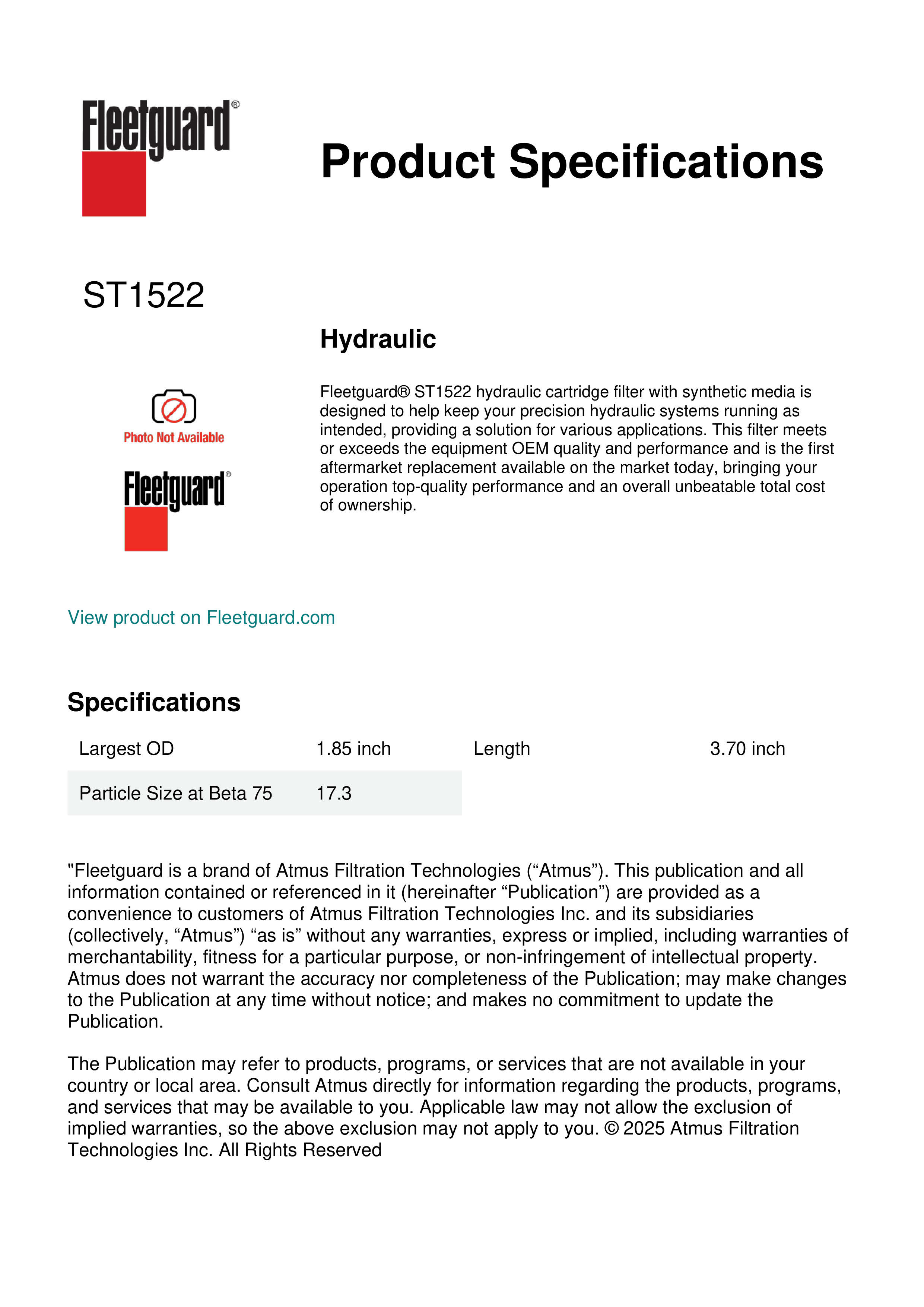 Fleetguard® ST1522 hydraulic cartridge filter with synthetic media is designed to help keep your precision hydraulic systems running as intended, providing a solution for various applications. This filter meets or exceeds the equipment OEM quality and performance and is the first aftermarket replacement available on the market today, bringing your operation top-quality performance and an overall unbeatable total cost of ownership.Specification
