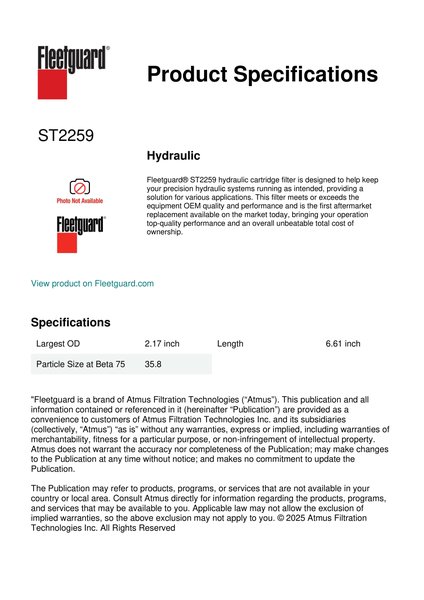 Fleetguard® ST2259 hydraulic cartridge filter is designed to help keep your precision hydraulic systems running as intended, providing a solution for various applications. This filter meets or exceeds the equipment OEM quality and performance and is the first aftermarket replacement available on the market today, bringing your operation top-quality performance and an overall unbeatable total cost of ownership.Specification