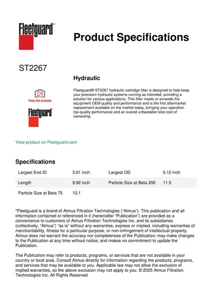 Fleetguard® ST2267 hydraulic cartridge filter is designed to help keep your precision hydraulic systems running as intended, providing a solution for various applications. This filter meets or exceeds the equipment OEM quality and performance and is the first aftermarket replacement available on the market today, bringing your operation top-quality performance and an overall unbeatable total cost of ownership.Specification