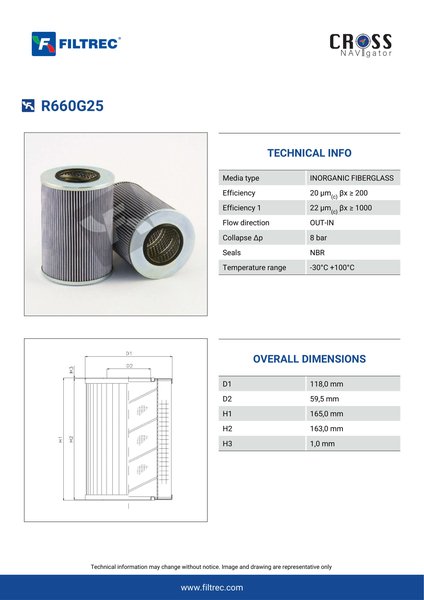 Genuine Filtrec R660G25. This Filtrec element is designed to meet or exceed the quality and performance of brand OEM’s ensuring superior filtration performance and long-lasting durability.Engineered with their high performance media and a durable design, the R660G25 provides reliable and consistent performance over its lifespan, even in harsh operating environments. When you order from FilterFinder, you can trust that you are getting a reliable and high-quality replacement filter that will keep your system running smoothly.