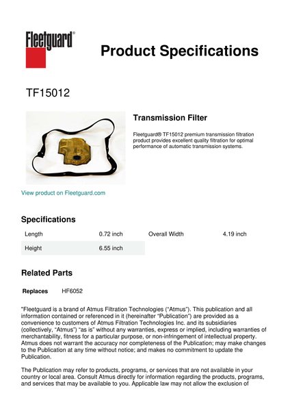 Fleetguard® TF15012 premium transmission filtration product provides excellent quality filtration for optimal performance of automatic transmission systems.Specification