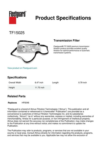 Fleetguard® TF15025 premium transmission filtration product provides excellent quality filtration for optimal performance of automatic transmission systems.Specification