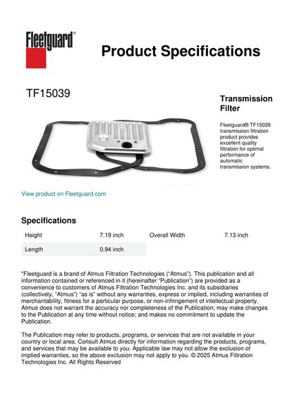 Fleetguard® TF15039 transmission filtration product provides excellent quality filtration for optimal performance of automatic transmission systems.Specification