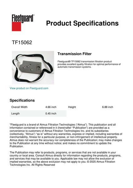 Fleetguard® TF15062 transmission filtration product provides excellent quality filtration for optimal performance of automatic transmission systems.Specification