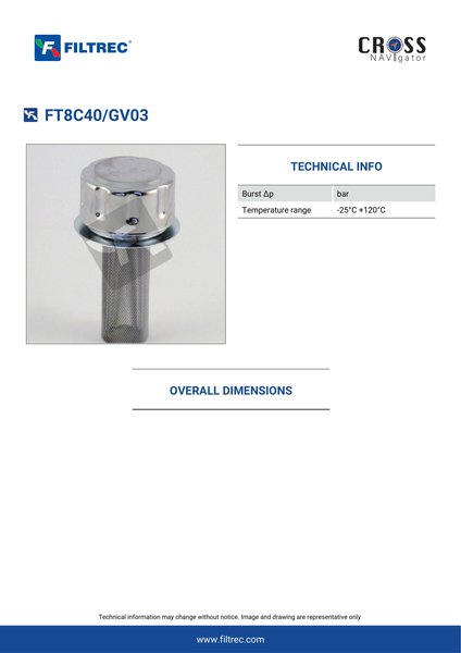 Genuine Filtrec FT8C40/GV03. This Filtrec element is designed to meet or exceed the quality and performance of brand OEM’s ensuring superior filtration performance and long-lasting durability.
