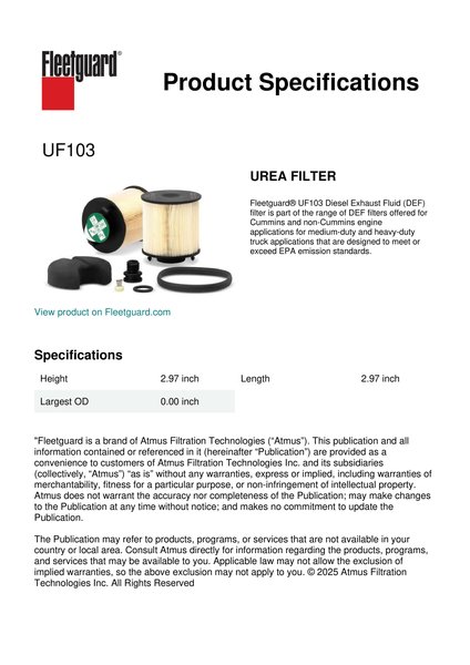 Fleetguard® UF103 Diesel Exhaust Fluid (DEF) filter is part of the range of DEF filters offered for Cummins and non-Cummins engine applications for medium-duty and heavy-duty truck applications that are designed to meet or exceed EPA emission standards.Specification