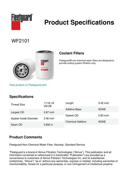 Choose Fleetguard® WF2101 non-chemical water filter with chemicals for coolant system protection that provides filtration only. Non-chemical water filters are designed for use with OAT technology (which doesn't require DCA's for maintenance) or Hybrid and Conventional systems using liquid DCA's for reinhibition.Specification
