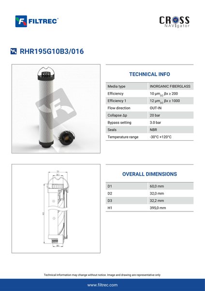 Genuine Filtrec RHR195G10B3/016. This Filtrec element is designed to meet or exceed the quality and performance of brand OEM’s ensuring superior filtration performance and long-lasting durability.