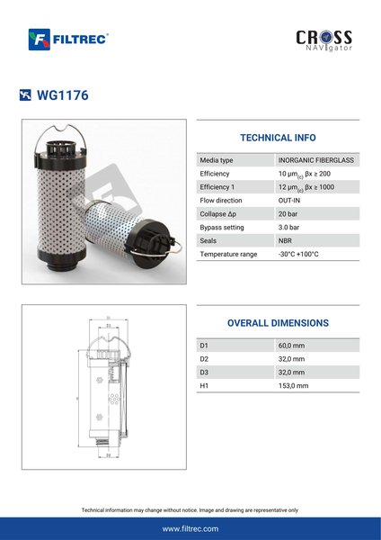 Genuine Filtrec WG1176. This Filtrec element is designed to meet or exceed the quality and performance of brand OEM’s ensuring superior filtration performance and long-lasting durability.