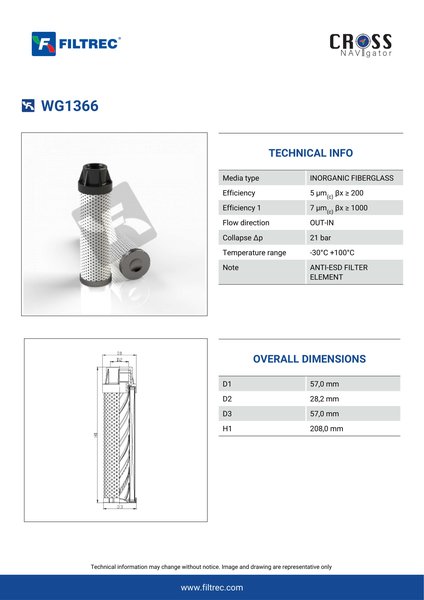 Genuine Filtrec WG1366. This Filtrec element is designed to meet or exceed the quality and performance of brand OEM’s ensuring superior filtration performance and long-lasting durability.