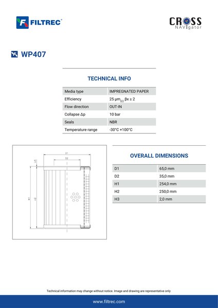 Genuine Filtrec WP407. This Filtrec element is designed to meet or exceed the quality and performance of brand OEM’s ensuring superior filtration performance and long-lasting durability.