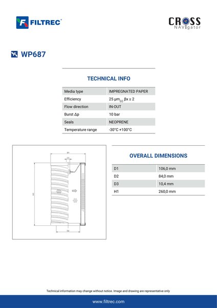 Genuine Filtrec WP687. This Filtrec element is designed to meet or exceed the quality and performance of brand OEM’s ensuring superior filtration performance and long-lasting durability.