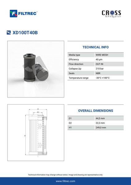 Genuine Filtrec XD100T40B. This Filtrec element is designed to meet or exceed the quality and performance of brand OEM’s ensuring superior filtration performance and long-lasting durability.